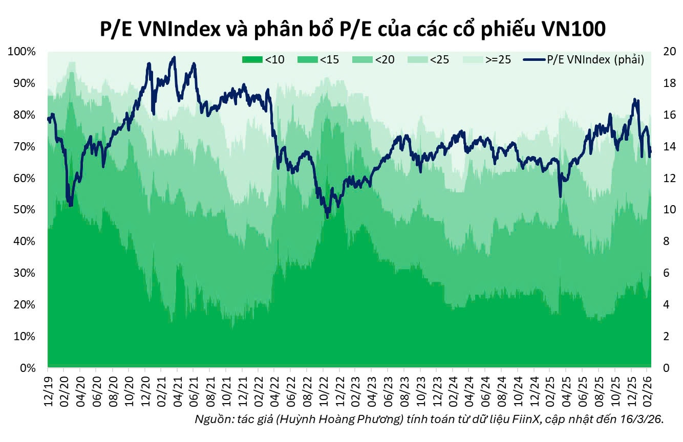 From a valuation perspective, that process is already underway. Prior to the sell-off, more than 80% of VN30 stocks were trading at elevated valuation levels, a hallmark of late-stage bull markets. The recent correction has brought many of these stocks back into more reasonable ranges, potentially supporting short-term technical rebounds.