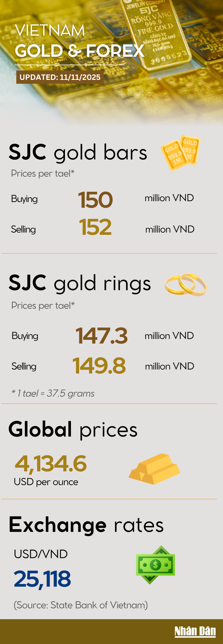 SJC gold bars and gold rings skyrocketed following world prices, listed at 152 million VND/tael and 149.8 million VND/tael, respectively on November 11.