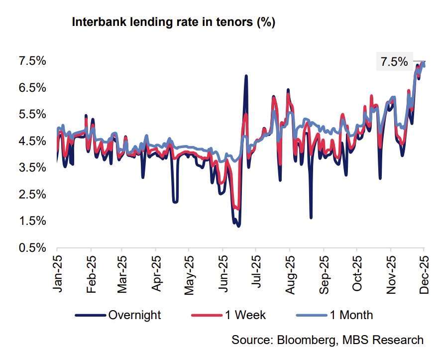 Credit growth strengthened sharply toward year-end, reaching 16.56% ytd as of 27 November—significantly higher than the 11.5% recorded in the same period last year. Against this backdrop, interbank overnight rates rose steadily from 5.4% at the start of November to 6.4% by month-end, then spiked to 7.5% in early December—the highest level in over three years. Meanwhile, rates for 1-week to 1-month tenors anchored at 7.2-7.4%, with 6-month rates hovering at 7.2%. In response, the SBV has raised the OMO interest rate by 50 basis points to 4.5%, marking the first rate hike in 19 months.