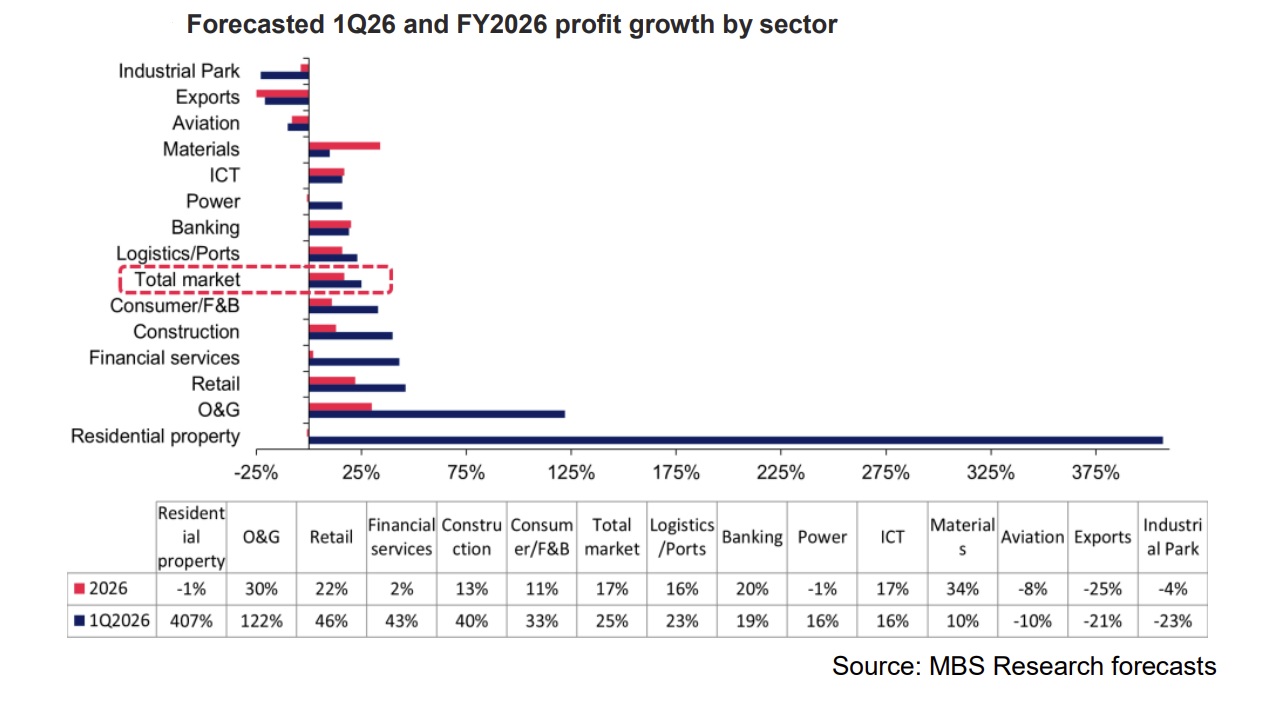 In 1Q26, MBS estimated that earnings across the overall market would post strong yoy growth of approximately 25%. However, this growth is unlikely to be broad-based, with gains concentrated in only a few sectors or companies benefiting from exceptional factors.