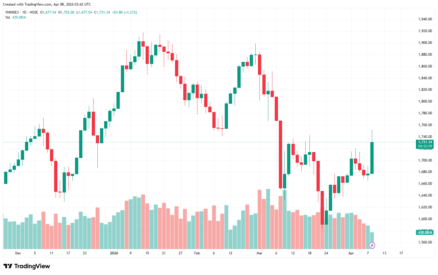 The VN-Index opened today with an incredible gap-up, rising by 74.51 points to reach 1,752.05 points.