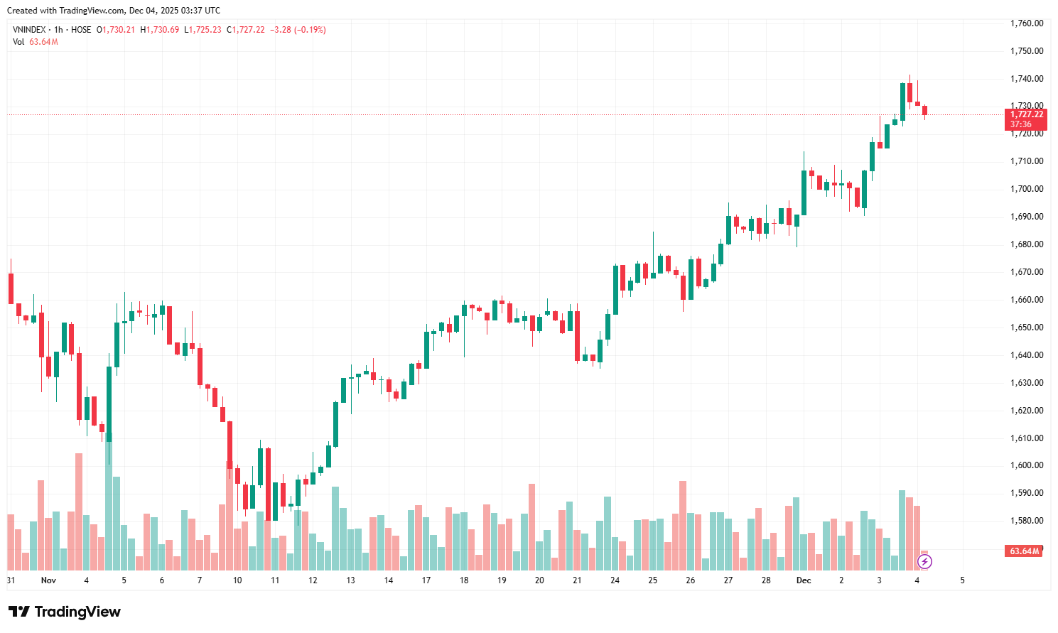 The general momentum continued to be reinforced in the afternoon session when the VN-Index continuously widened its range and reached the highest peak of the session at 1,741.65. Banking and retail stocks remained the main focus, with purple appearing in FRT, MWG, and CTG during the session, and other stocks in the same group also recorded a good increase of over 3%. Demand spread across the market as many groups welcomed the participation of cash flow, such as steel, industrial parks, and public investment stocks.