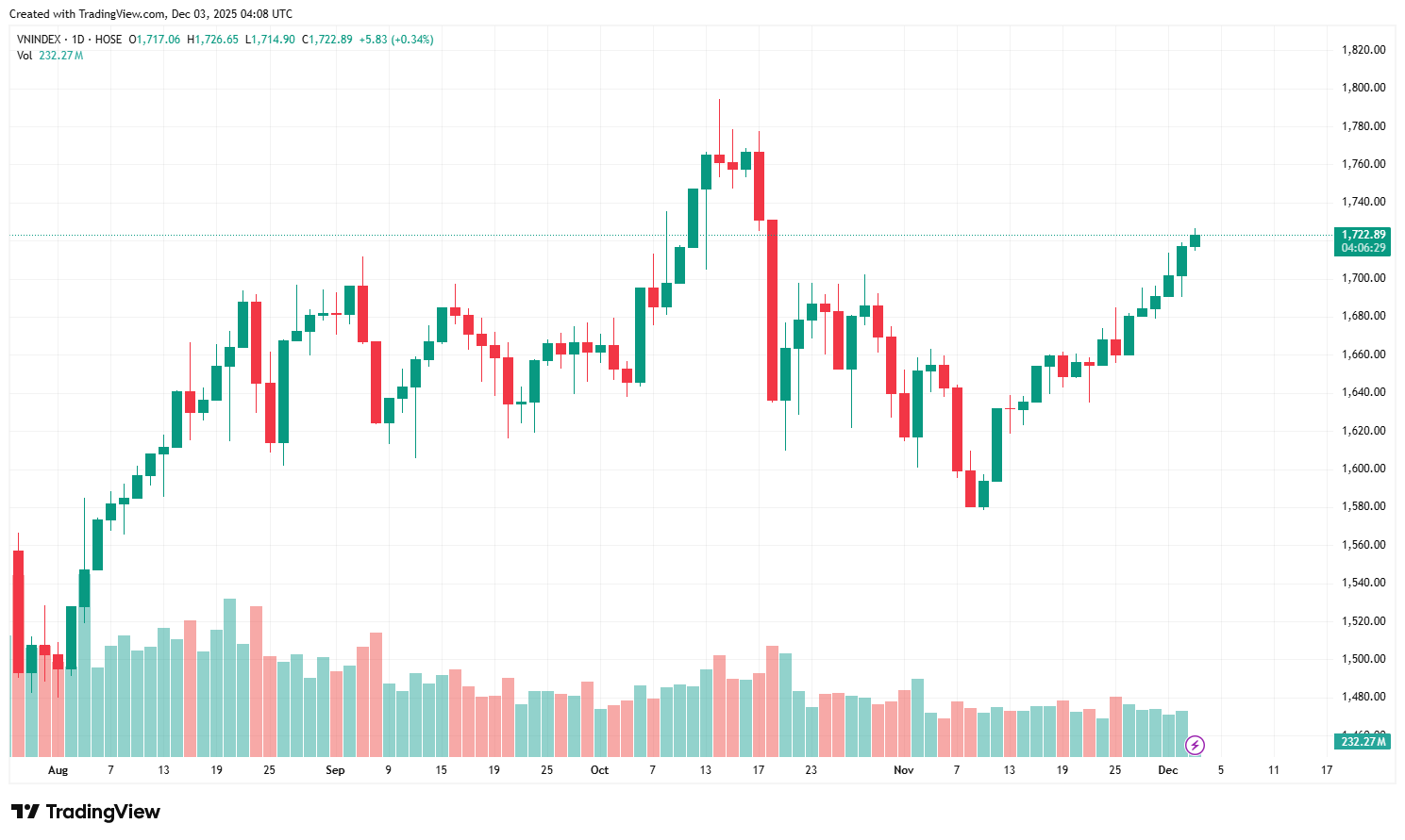 The VN-Index continued to follow the upward momentum and closed yesterday's session close to 1,720 points.