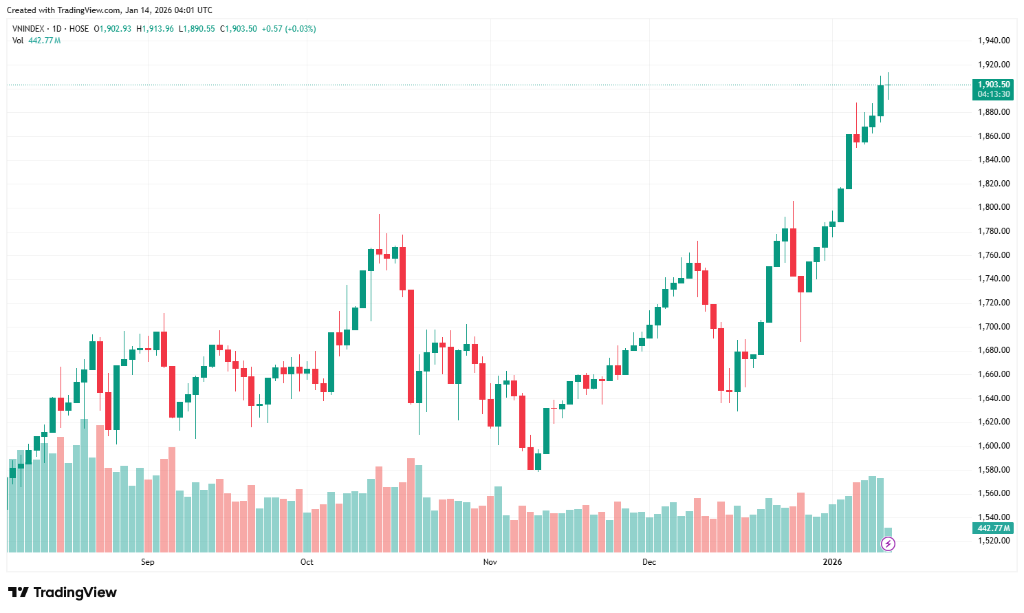 At the close of yesterday's session, the VN-Index closed at 1,902.93 points, up 25.60 points, or 1.36%, thanks to strong buying pressure in large-cap stocks.
