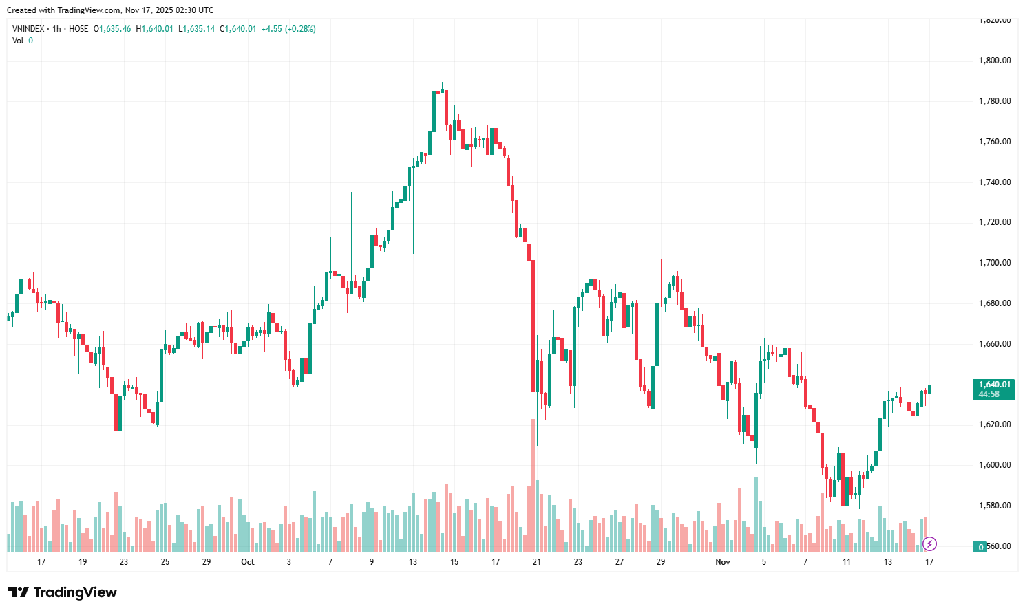 At the end of the session, the VN-Index closed at 1,635.46 points, up 4.02 points, equivalent to 0.25%. At the end of the week, it increased by 36.36 points (2.27%) compared to the previous week.