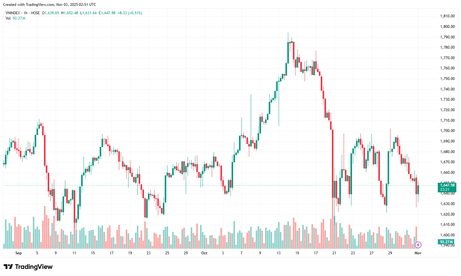 At the end of the last session, VN-Index closed at 1,639.65 points, down 29.92 points, equivalent to 1.79%.