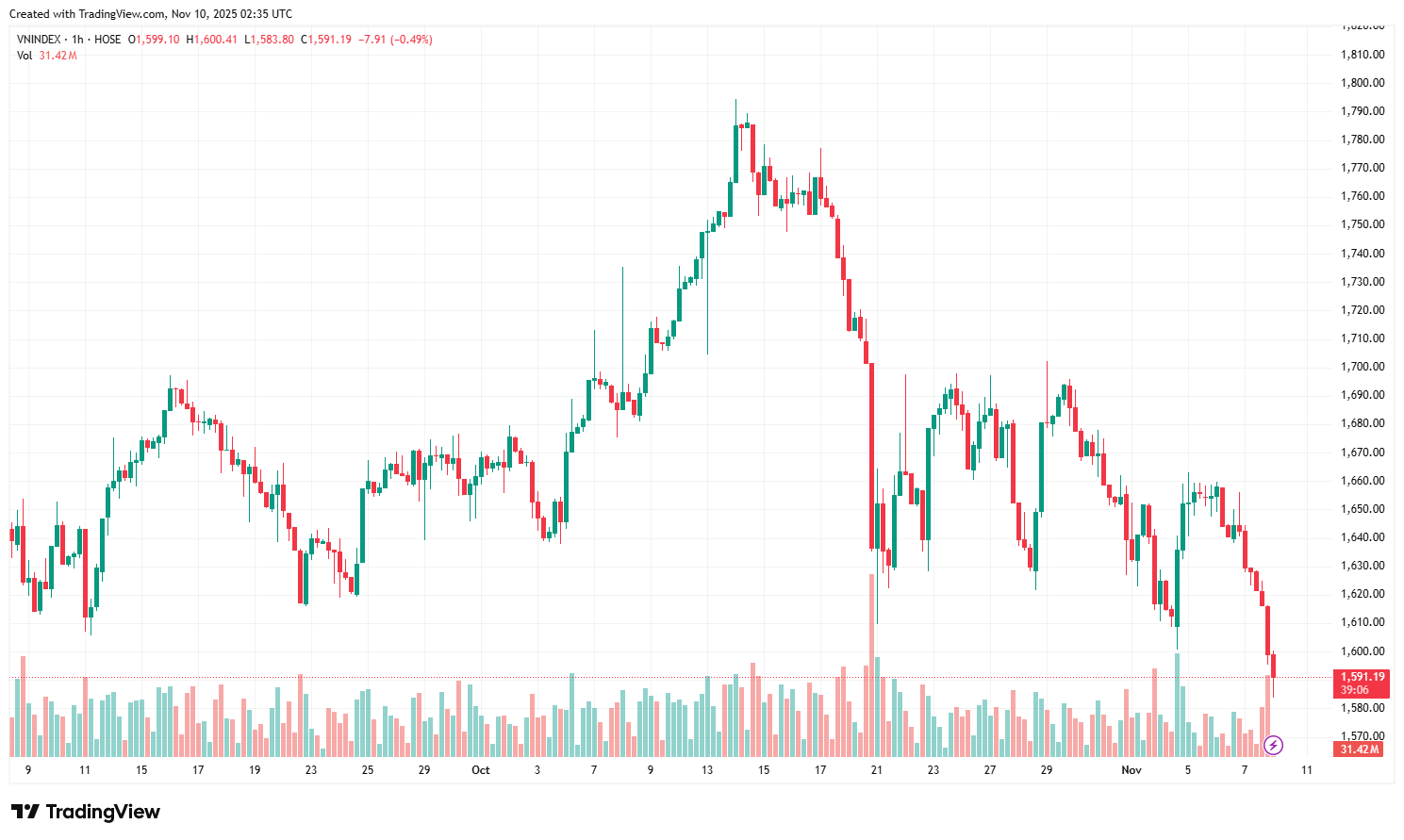 At the end of the session, VN-Index closed at 1,599.10 points, down 43.54 points, equivalent to 2.65%. At the end of the week, VN Index decreased by 40.55 points (-2.47%) compared to last week.
