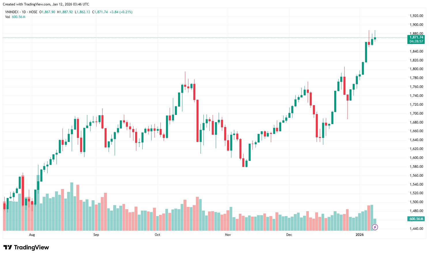 At the close of trading, the VN-Index closed at 1,867.9, up 12.34 points, or 0.67%. For the week, the VN-Index increased by 83.41 points (4.67%) compared to the previous week.