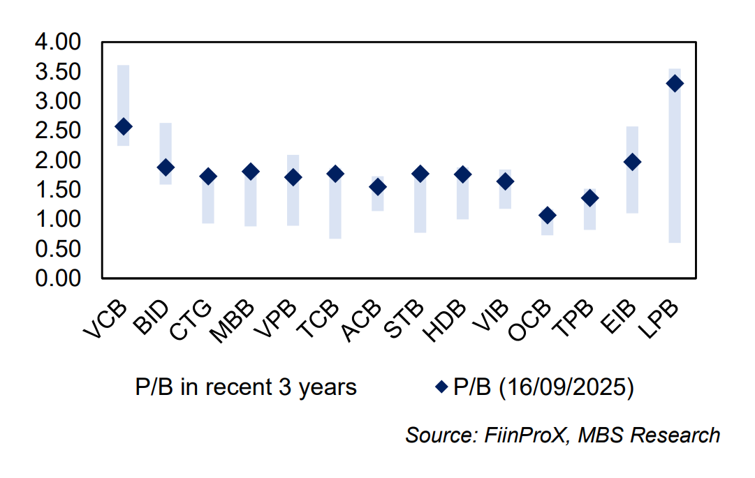 For CTG, its credit growth in 3Q25 is estimated to be over 5% quarter on quarter, bringing YTD growth to more than 15% by the end of September 2025. MBS anticipates CTG to get an extra 3% credit quota in 4Q25, with full-year credit growth of roughly 18%. NIM is expected to remain steady at 2.5%. Provisioning expenditures in 3Q25 are expected to be roughly VND 6.5 tn, down 29.8% year-on-year but tripling QoQ due to the low base in 2Q after high provisioning in 1Q. Provisioning in the third quarter is likely to continue strong, in keeping with the bank's full-year target of VND 20-25 trillion. Consequently, 3Q25 profit before tax (PBT) is forecast to reach approximately VND 9.5 tn (44.8% YoY), lifting 9M25 PBT to VND 28.4 tn (45.6% YoY), equivalent to about 75% of the full-year target.