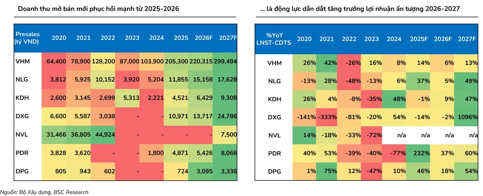 Beyond VIC and VHM, which dominate both the economy and the real estate market—VHM alone accounts for around 80% of total revenue among listed residential developers—analysts at BSC expect industry profits to recover strongly this year.